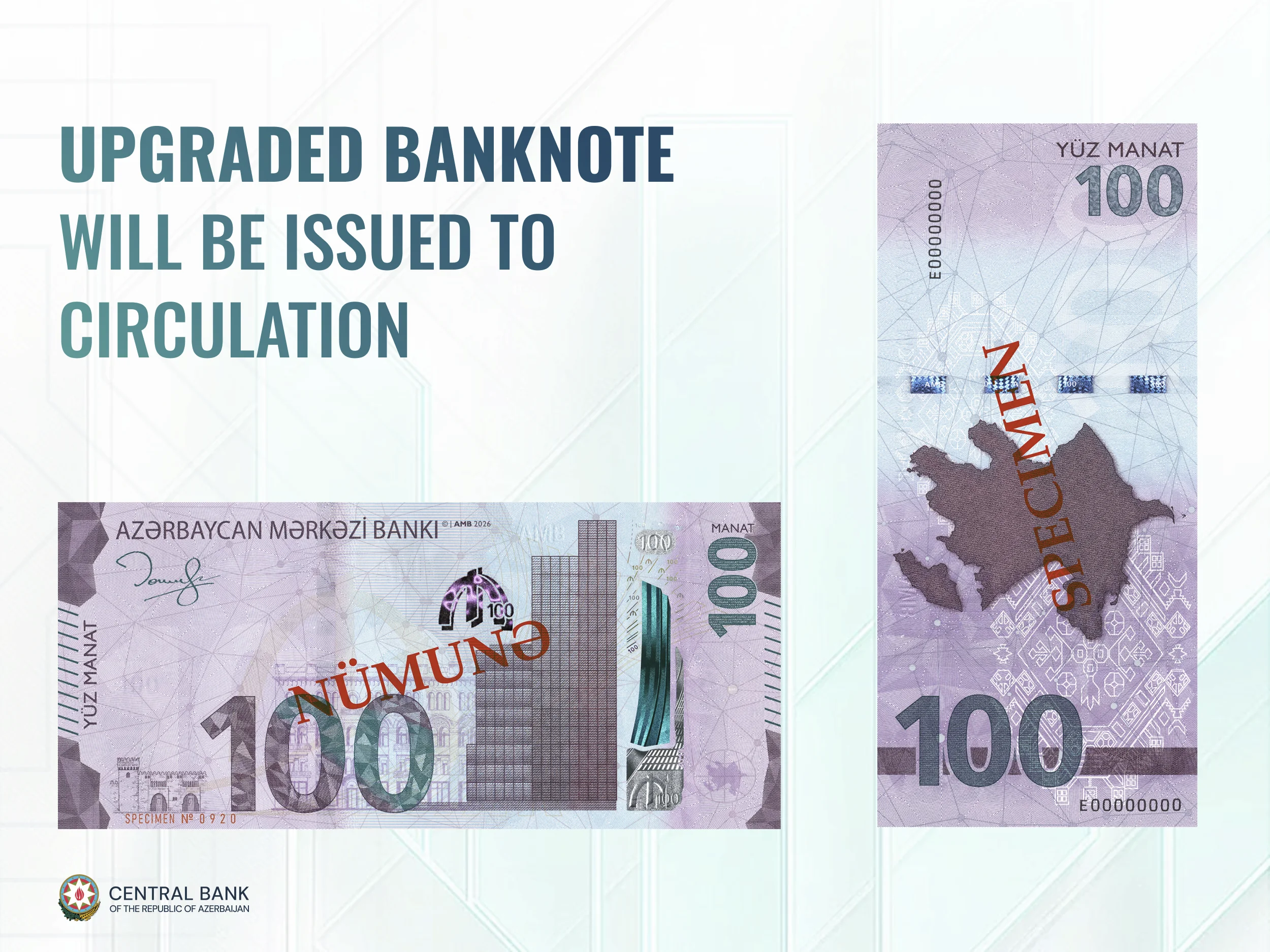 20.04.2026Центральный банк Азербайджана объявил, что модернизированная банкнота номиналом 100 манатов с обновленным дизайном будет введена в обращение 15 июля 2026 года.
